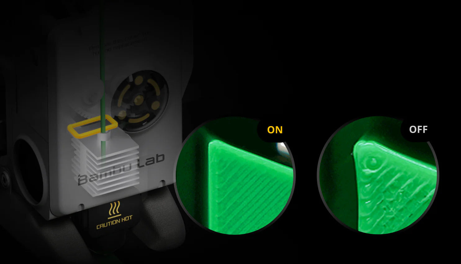 L'A1 révolutionne le contrôle du flux en impression 3D grâce à son capteur haute fréquence et haute résolution à courant de Foucault qui mesure la pression dans la buse. Un algorythme permet ensuite de compenser de façon active le flux d'extrusion en finesse.