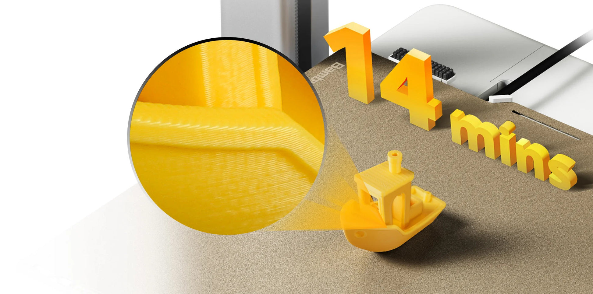 L'A1 imprime en 14 minutes à peine le bateau de test en respectant toutes les contraintes de qualité grâce à ses guides entièrement en métal, sa structure rigide, son accéléromètre, son MCU puissant et par-dessus tout son système avancé de contrôle des déplacements. Elle atteint ses performance à condition d'utiliser des filaments spécialisés.